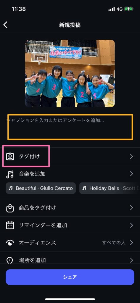 キャプション欄に何かコメントを入れたら、“タグ付け”をクリックする。