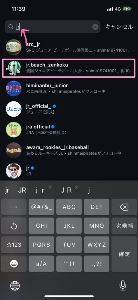 「jr」と入れると全国ジュニアビーチアカウントが出てくるはずなので、出てきたらアカウントを選択する。