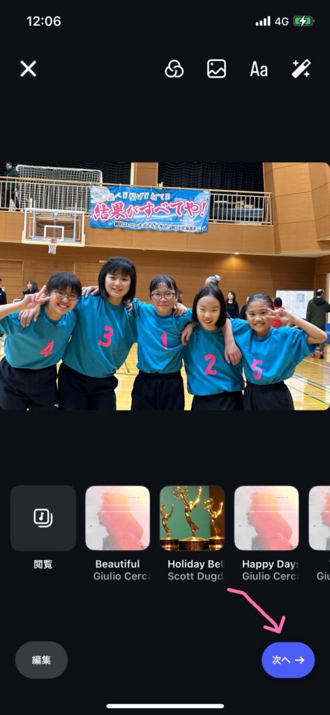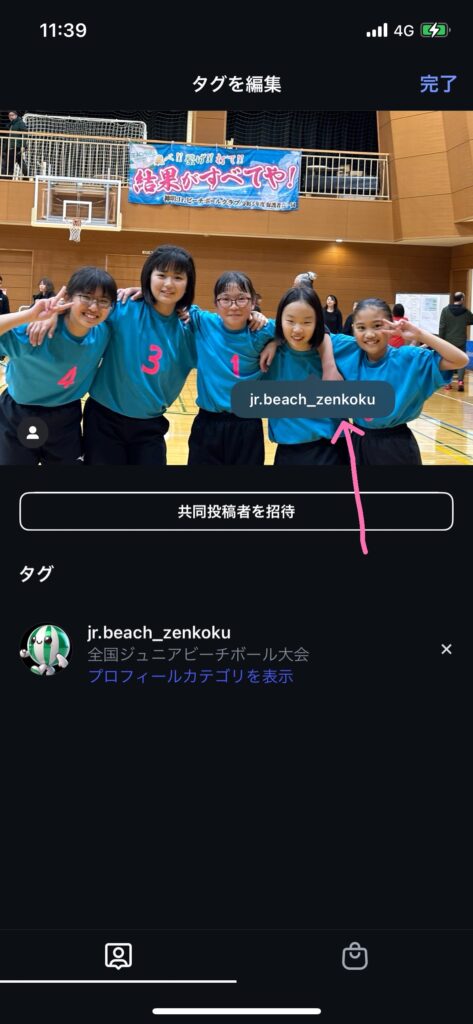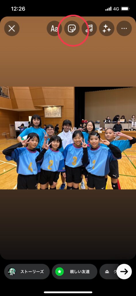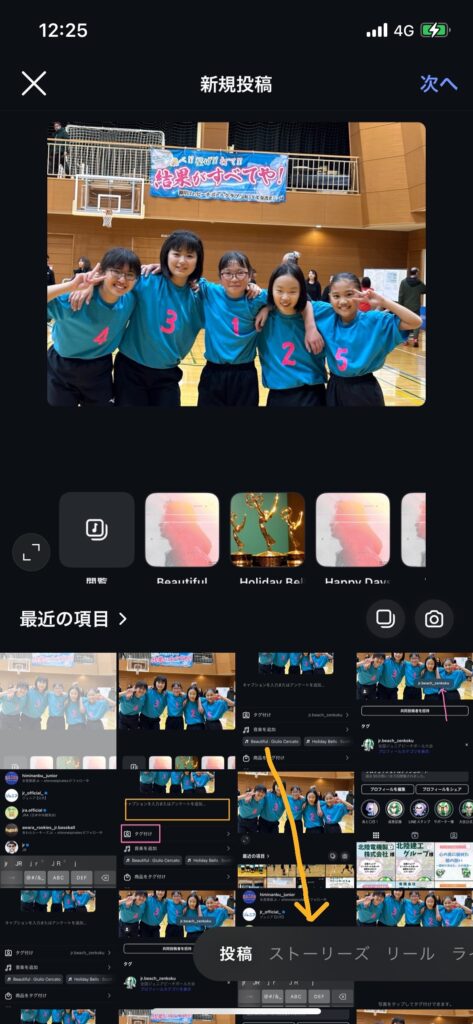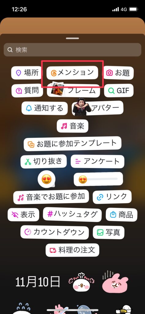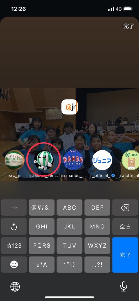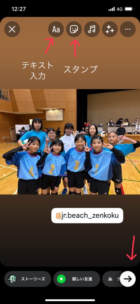 メンション付けができ、右下の→ボタンを押せば、ストーリーズ投稿完了!